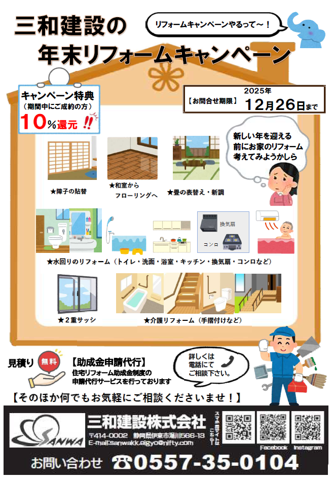 お知らせ リフォーム 年末リフォームキャンペーン実施中 お知らせ リフォーム 2025/11/17 年末リフォームキャンペーン実施中 年末リフォームキャンペーン実施中です。お問合せは、12月26日までとなっております。お気軽にお問い合わせください。 戻る